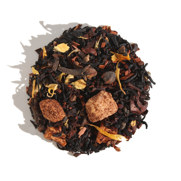 Herbal: Red Rooibos Tea, Honeybush Tea, Cardamom, Clove, Ginger, Cinnamon, Calendula, Caramel/Apricot Essences