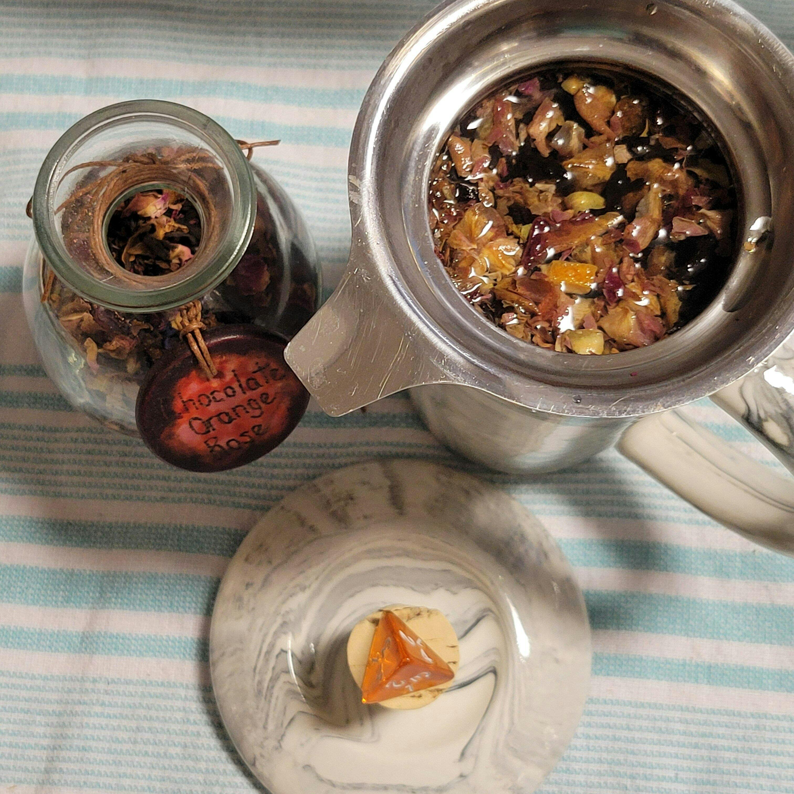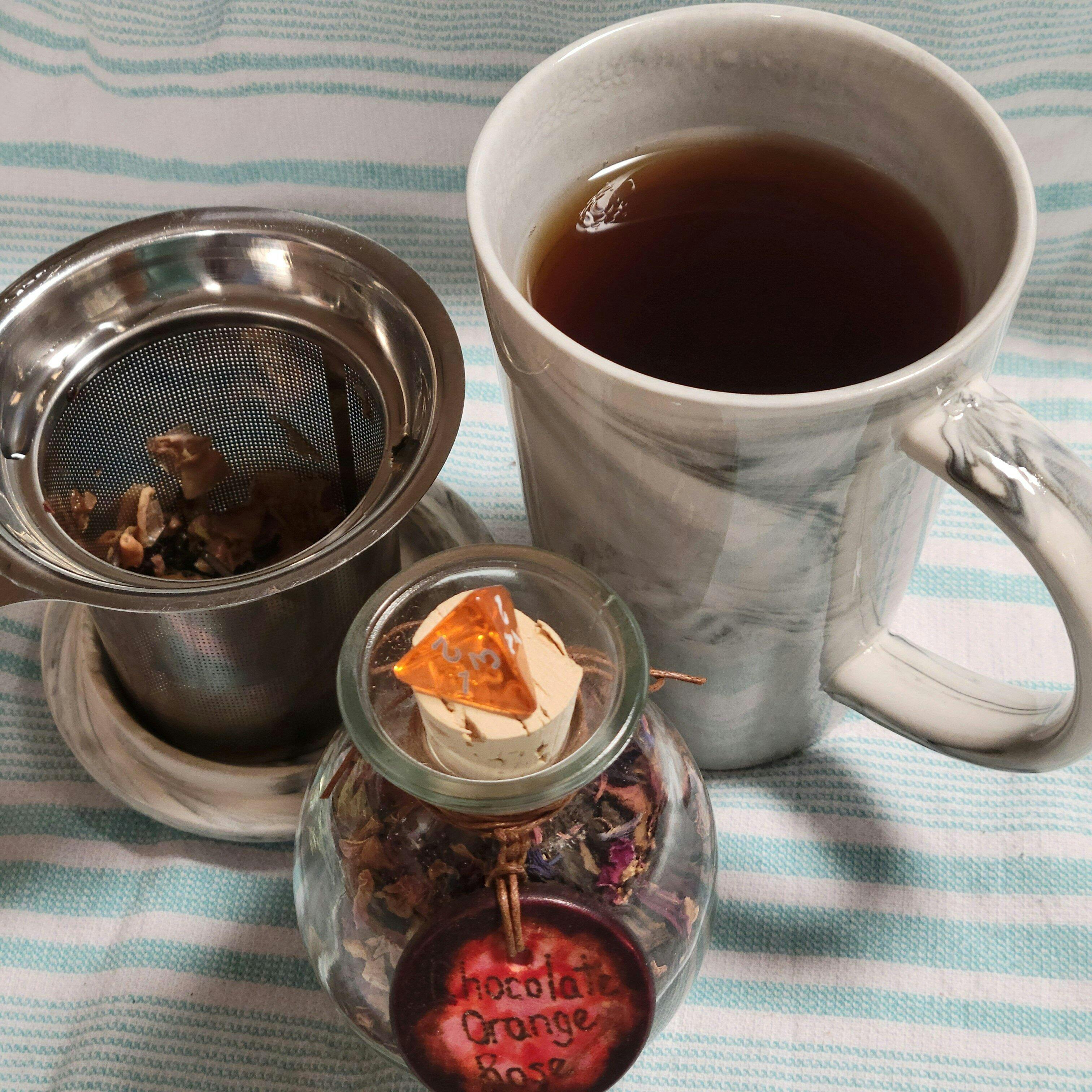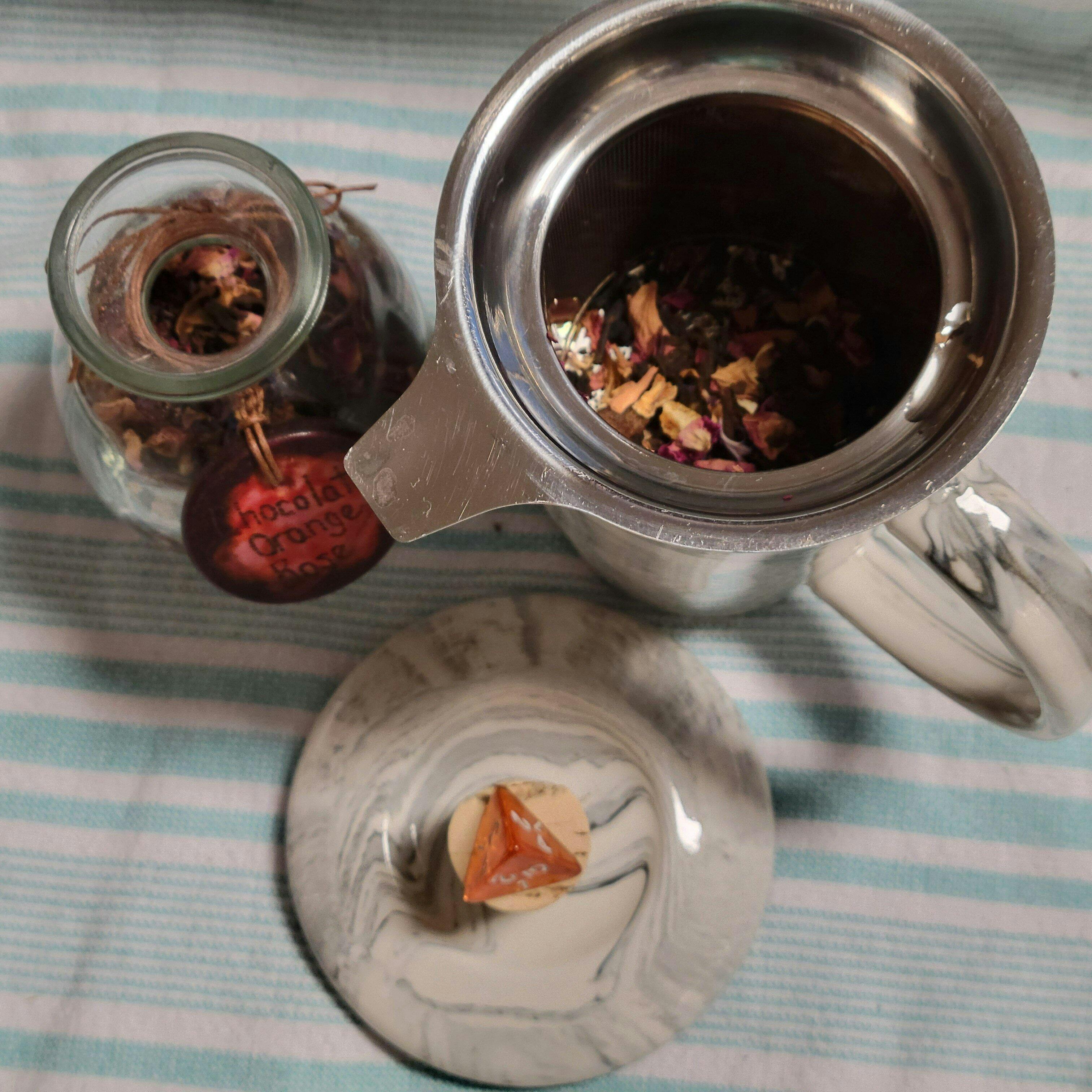 Puerh Tea, Orange Peel, Rose Petals, Cocoa Nib, Blue Cornflower, Natural Flavor* * Chocolate / Orange Essences