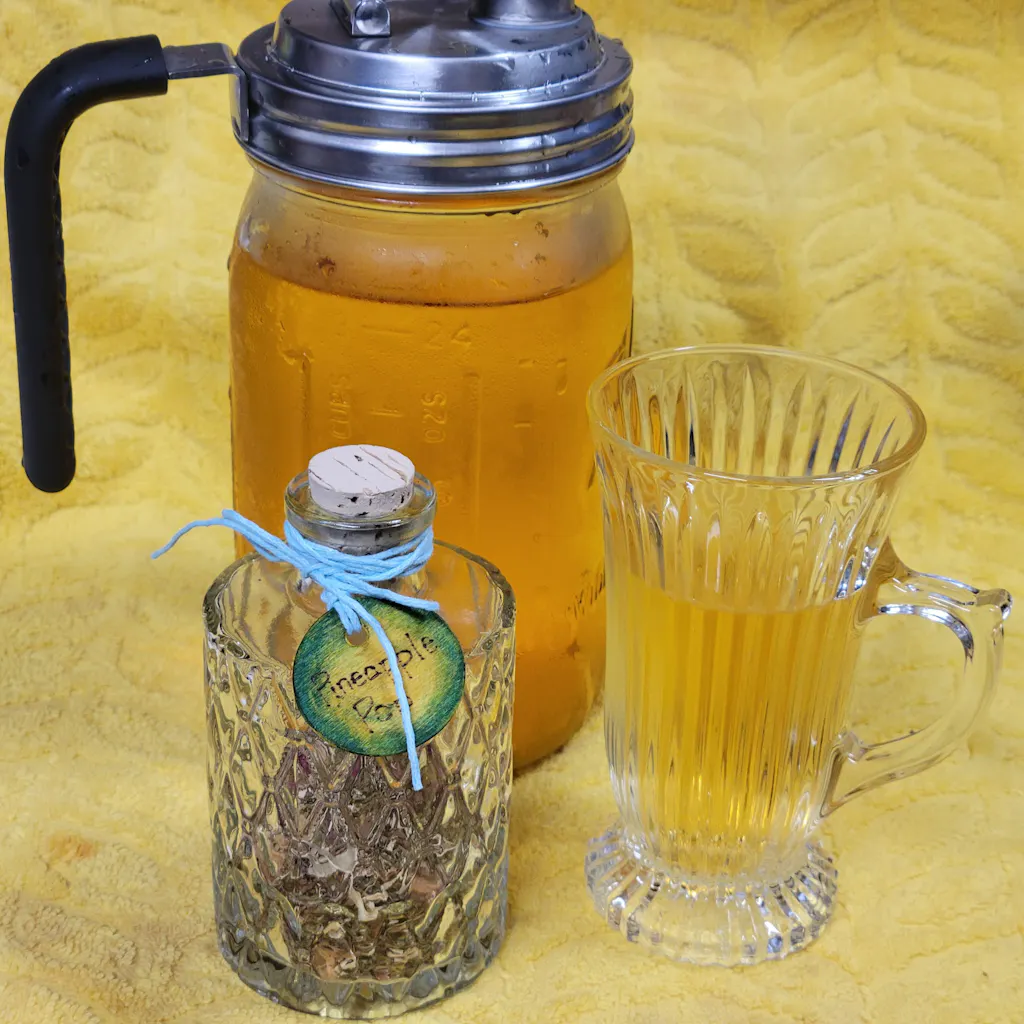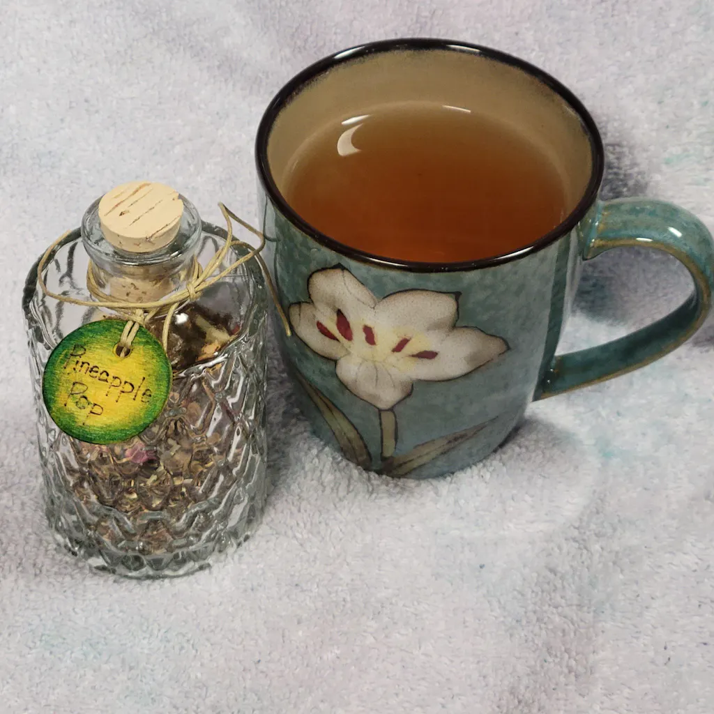 Green Rooibos, Pineapple Pieces, Apple Pieces, Mango Pieces, Peach Pieces, Rosehips, Lemongrass, Orange Peel, Calendula, Blue Cornflowers, Pineapple Essence
