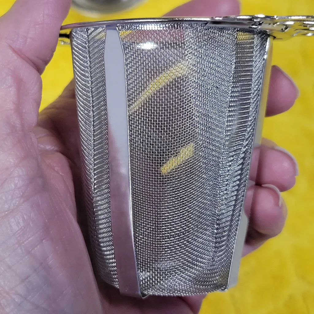 4.5" W x 2.75" H. Stainless steel. Best hand-washed, do not microwave.