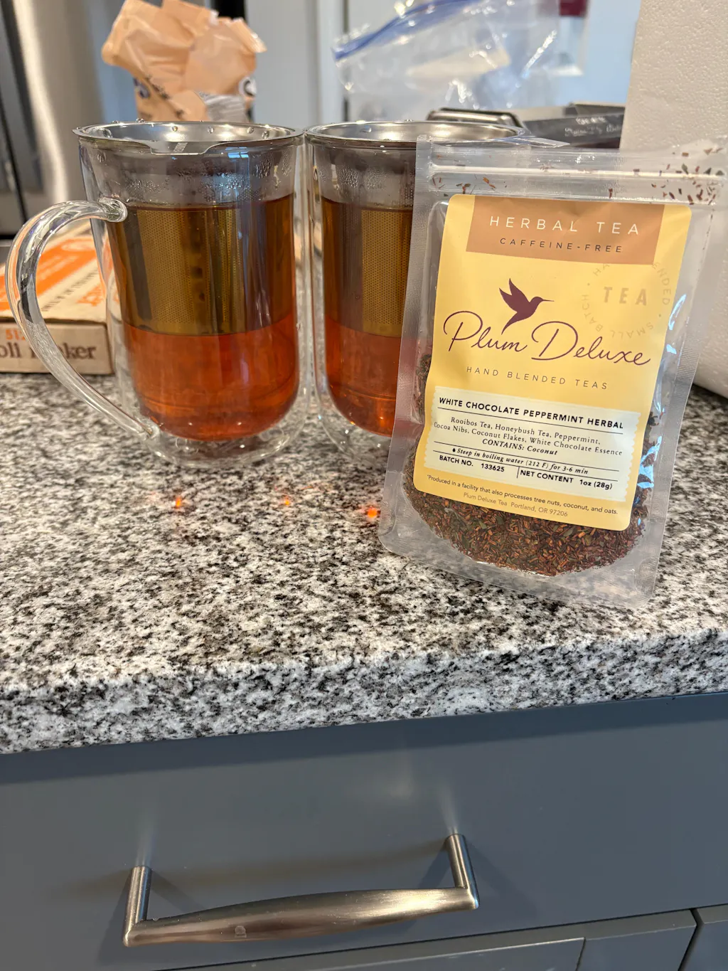Rooibos Tea, Honeybush Tea, Peppermint, Cocoa Nibs, Coconut Flakes, White Chocolate Essence.